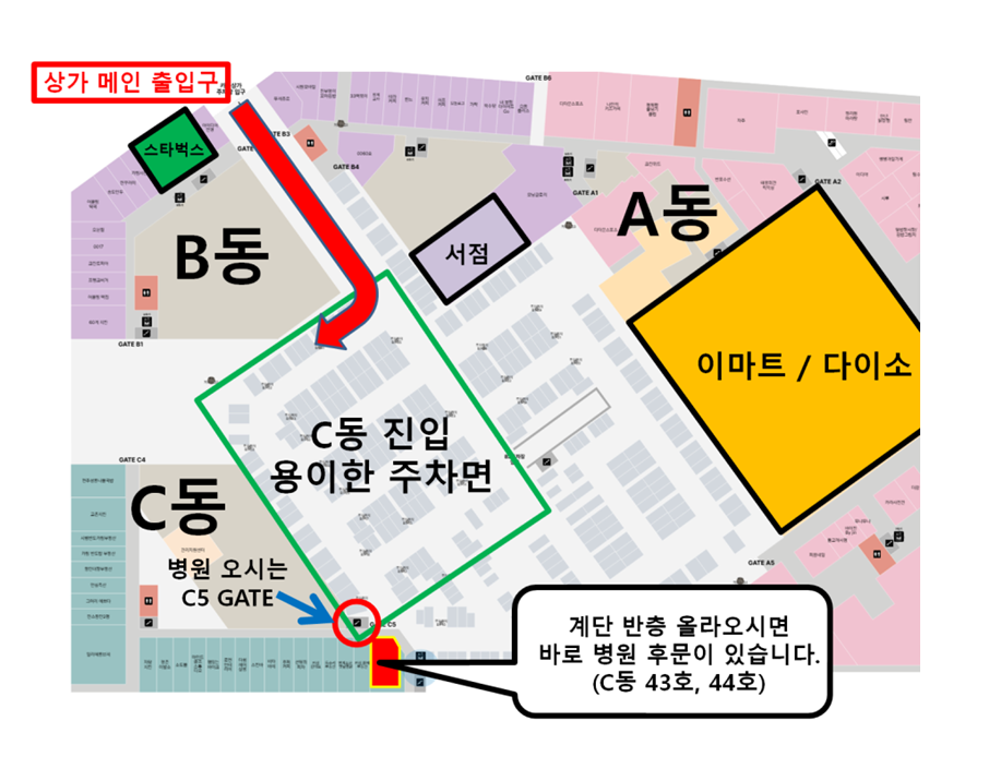 주차장 안내 “카림 애비뉴 스타벅스” 옆에 위치한 상가 주차장으로 진입하세요.첫번째 코너에서 우회전 하시면 병원 접근이 용이한 주차면이 있습니다.(다른 면에 주차하시고 걸어오셔도 무방합니다.)C동은 상가진출입구가 “C5 게이트” 단 하나입니다. 여기로 들어오시면 됩니다.계단 반층 올라오시면 바로 병원 후문이 있습니다. (직원 전용 출입구) 여기서 좌측에 보이는 모퉁이 코너를 도시면 건물 밖으로 나가는 출구와 병원 보조 출입구가 엘레베이터 옆에 위치하고 있습니다. NOTICE) 주차장에서 길찾기가 어려우신 보호자님은 병원으로 전화주시면 상세히 다시 안내해드리겠습니다,(031-831-8119)